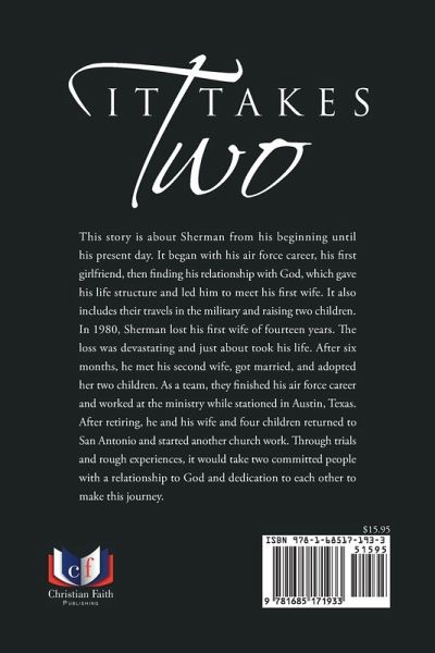 This story is about Sherman from his beginning until his present day. It began with his air force career, his first girlfriend, then finding his relationship with God, which gave his life structure and led him to meet his first wife. It also includes their travels in the military and raising two children. In 1980, Sherman lost his first wife of fourteen years. The loss was devastating and just about took his life. After six months, he met his second wife, got married, and adopted her two children. As a team, they finished his air force career and worked at the ministry while stationed in Austin, Texas. After retiring, he and his wife and four children returned to San Antonio and started another church work. Through trials and rough experiences, it would take two committed people with a relationship to God and dedication to each other to make this journey.