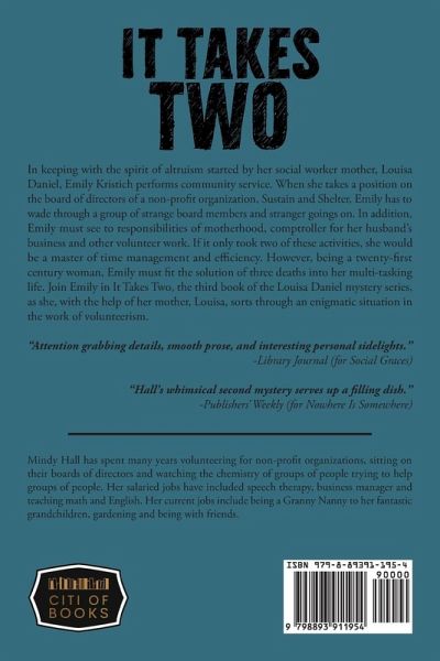 In keeping with the spirit of altruism started by her social worker mother, Louisa Daniel, Emily Kristich performs community service. When she takes a position on the board of directors of a non-profit organization, Sustain and Shelter, Emily has to wade through a group of strange board members and stranger goings on. In addition, Emily must see to responsibilities of motherhood, comptroller for her husband's business and other volunteer work. If it only took two of these activities, she would be a master of time management and efficiency. However, being a twenty-first century woman, Emily must fit the solution of three deaths into her multi-tasking life. Join Emily in It Takes Two, the third book of the Louisa Daniel mystery series, as she, with the help of her mother, Louisa, sorts through an enigmatic situation in the work of volunteerism. "Attention grabbing details, smooth prose, and interesting personal sidelights."-Library Journal (for Social Graces) "Hall's whimsical second mystery serves up a filling dish."Publishers' Weekly (for Nowhere Is Somewhere)