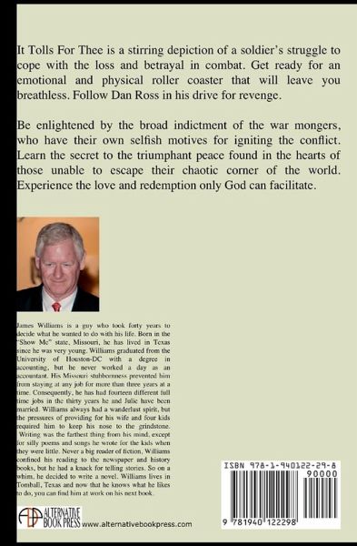 It Tolls For Thee is a stirring depiction of a soldier's struggle to cope with the loss and betrayal in combat. Get ready for an emotional and physical roller coaster that will leave you breathless. Follow Dan Ross in his drive for revenge. Be enlightened by the broad indictment of the war mongers, who have their own selfish motives for igniting the conflict. Learn the secret to the triumphant peace found in the hearts of those unable to escape their chaotic corner of the world. Experience the love and redemption only God can facilitate.