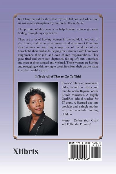 But I have prayed for thee, that thy faith fail not; and when thou art converted, strengthen thy brethren." (Luke 22:32) The purpose of this book is to help hurting women get some healing through my experiences. There are a lot of hurting women in the world, in and out of the church, in different environments and situations. Oftentimes these women are too busy taking care of the duties of the household, their husbands, helping their children with homework assignments, their jobs and even church responsibilities. They grow tired and worn out, depressed, feeling left out, unnoticed and even at times abused and violated. These women are hurting and struggling within trying to break free from their past to make it to their wealthy place. It Took All of That to Get To This!