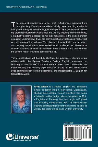 The series of recollections in this book reflect many episodes from throughout my life and career. When I initially began teaching in schools in England, in English and Theology, I had no particular expectations of where my teaching experiences would lead me. As my teaching career unfolded, it gradually became apparent to me that, regardless of the subject matter ostensibly under review, it was the communication of that subject matter that was of paramount importance. The style and tone of that communication, and the way the students were treated, would make all the difference to whether a connection could be made with those students – and thus whether the subject matter would be transmitted at all. These recollections will hopefully illustrate this principle – whether as an Adviser within the Sydney Teachers’ College English department, or lecturing at the Nurses’ Communication Course. Most particularly, my many teaching and learning experiences led me to the field within which good communication is both fundamental and indispensable … English for Special Education.