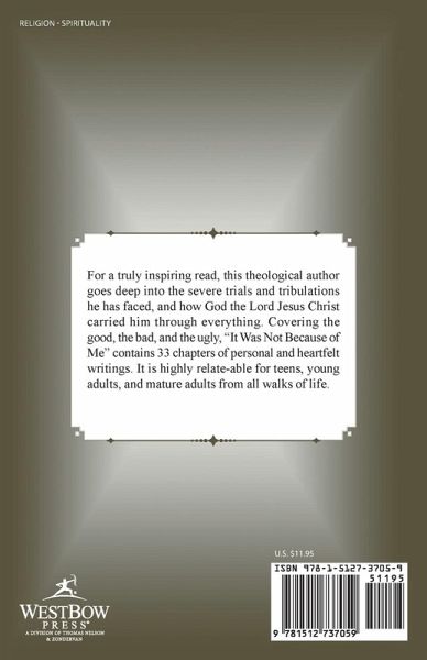 For a truly inspiring read, this theological author goes deep into the severe trials and tribulations he has faced, and how God the Lord Jesus Christ carried him through everything. Covering the good, the bad, and the ugly, "It Was Not Because of Me" contains 33 chapters of personal and heartfelt writings. It is highly relate-able for teens, young adults, and mature adults from all walks of life.
