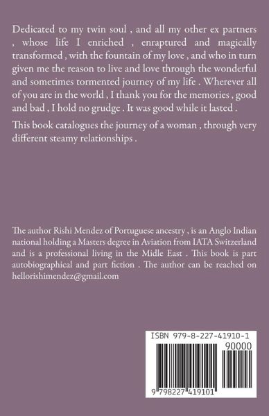 Dedicated to my twin soul , and all my other ex partners , whose life I enriched , enraptured and magically transformed , with the fountain of my love , and who in turn given me the reason to live and love through the wonderful and sometimes tormented journey of my life . Wherever all the six of you are in the world , I thank you for the memories , good and bad , I hold no grudge . It was good while it lasted . This book catalogues the journey of a woman , through six very different steamy relationships .