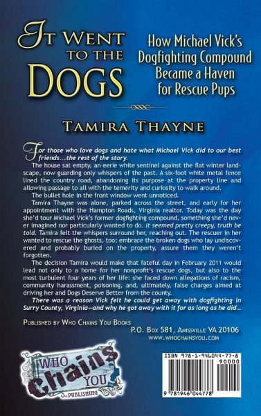 For those who love dogs and hate What Michael Vick did to our best Friends...the rest of the story. It Went to the Dogs How Michael Vick's Dogfighting Compound Became a Haven for Rescue Pups Expanded Edition Tamira Thayne For those who love dogs and hate What Michael Vick did to our best Friends...the rest of the story. What could possibly go wrong when a dog activist buys Michael Vick's dogfighting compound? As it turns out...everything. ¿¿¿ The house sat empty, an eerie white sentinel against the flat winter landscape, now guarding only whispers of the past. A six-foot white metal fence with coded entry gate lined the country road, abandoning its purpose at the property line and allowing passage to all with the temerity and curiosity to walk around. The bullet hole in the front window went unnoticed. ¿¿¿ Tamira Thayne was alone, parked across the street, and early for her appointment with the Hampton Roads, Virginia realtor. Today was the day she'd tour Michael Vick's former dogfighting compound, something she'd never imagined nor particularly wanted to do. It seemed pretty creepy, truth be told. Tamira felt the whispers surround her, reaching out. The rescuer in her wanted to rescue the ghosts, too; embrace the broken dogs who lay undiscovered and probably buried on the property, assure them they weren't forgotten. She shuddered, pulling herself together. ¿¿¿ The decision Tamira would make that fateful day in February 2011 would lead not only to a home for her nonprofit's rescue dogs, but also to the most turbulent four years of her life: she faced down allegations of racism, community harassment, poisoning, and, ultimately, false charges aimed at driving her and Dogs Deserve Better from the county. There was a reason Michael Vick felt he could get away with dogfighting in Surry County, Virginia-and why he got away with it for as long as he did... With over 235 bw photos and documents. Expanded, casebound edition contains 15 extra pages of before and after rescue photos.
