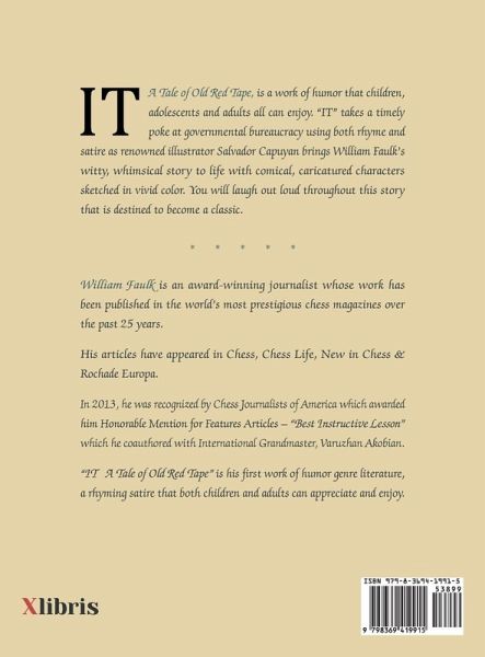 IT A Tale of Old Red Tape, is a work of humor that children, adolescents and adults all can enjoy. "IT" takes a timely poke at governmental bureaucracy using both rhyme and satire as renowned illustrator Salvador Capuyan brings William Faulk's witty, whimsical story to life with comical, caricatured characters sketched in vivid color. You will laugh out loud throughout this story that is destined to become a classic.