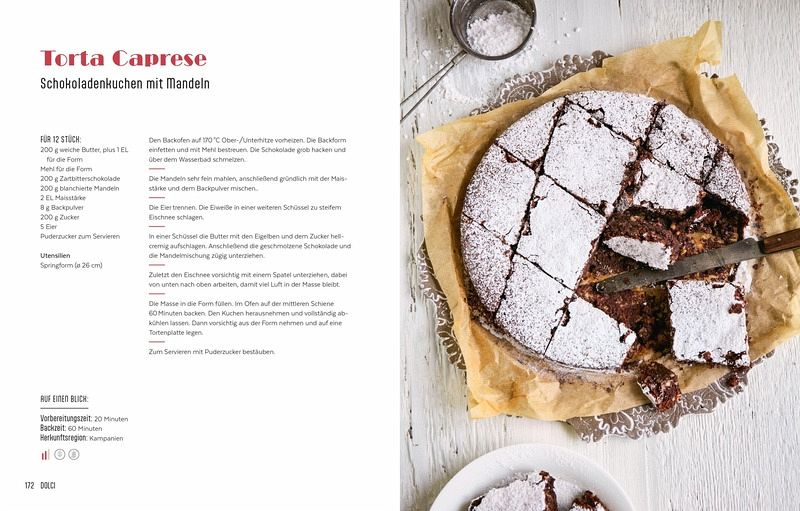 Die weiteren Kapitel – Secondi, Contorni und Dolci – sind ebenso vielseitig und gelungen. Die "Verdure grigliate" etwa sind ein wunderbares Beispiel für ein schlichtes, aber raffiniertes Gemüsegericht, das hervorragend als Beilage oder leichtes Hauptgericht funktioniert. Und natürlich ist das Kapitel der Süßspeisen ein kleines Paradies: Ob Kuchen oder Dessert – was hier vorgestellt wird, ist himmlisch gut und lässt keinen hungrig vom Tisch aufstehen.
