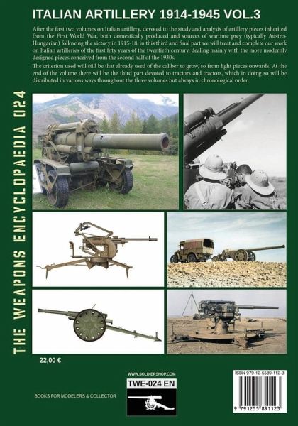 After the first two volumes on Italian artillery, devoted to the study and analysis of artillery pieces inherited from the First World War, both domestically produced and sources of wartime prey (typically Austro-Hungarian) following the victory in 1915-18; in this third and final part we will treat and complete our work on Italian artilleries of the first fifty years of the twentieth century, dealing mainly with the more modernly designed pieces conceived from the second half of the 1930s. The criterion used will still be that already used of the caliber to grow, so from light pieces onwards. At the end of the volume there will be the third part devoted to tractors and tractors, which in doing so will be distributed in various ways throughout the three volumes but always in chronological order.