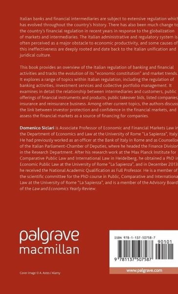 Italian banks and financial intermediaries are subject to extensive regulation which has evolved throughout the country's history. There has also been much change to the country's financial regulation in recent years in response to the globalization of markets and intermediaries. The Italian administrative and regulatory system is often perceived as a major obstacle to economic productivity, and some causes of this ineffectiveness are deeply rooted and date back to the Italian unification and juridical culture.This book provides an overview of the Italian regulation of banking and financial activities, and tracks the evolution of its 'economic Constitution' and market trends. It explores a range of topics within Italian regulation, including the regulation of banking activities, investment services and collective portfolio management. It examines in detail the relationship between intermediaries and customers, public offerings of financial instruments and products, public takeover bids, listed companies, insurance and reinsurance business. Among other current topics the authors discuss the link between investor protection and confidence in the financial markets; and assess the financial markets as a source of financing for companies.
