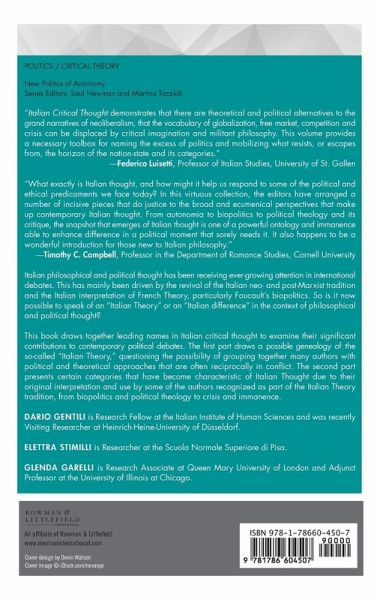 Introduction: Alternative Narrative and Political Operation Dario Gentili and Elettra Stimilli / Part One: Genealogies / Chapter 1: German Philosophy French Theory Italian Though Roberto Esposito / Chapter 2: Post-operaism? No Operaism Toni Negri / Chapter 3: Italian Theory? Elements for a Genealogy Sandro Chignola / Chapter 4: Italian Theory and its Differences: Subjectivation Historicization Conflict Judith Revel / Chapter 5: Old Courses in New Countries Mario Tronti / Part Two: Categories / Chapter 6: A World to Gain. On the Borders of Theory Sandro Mezzadra / Chapter 7: Politics and Philosophy in Italian Radical Thought Elettra Stimilli / Chapter 8: The Crisis Dispositive: Political Theology and Biopolitics Dario Gentili / Chapter 9: Inhabiting Immanence. The Logic History and Politics of an Italian Thought's Concept Roberto Ciccarelli