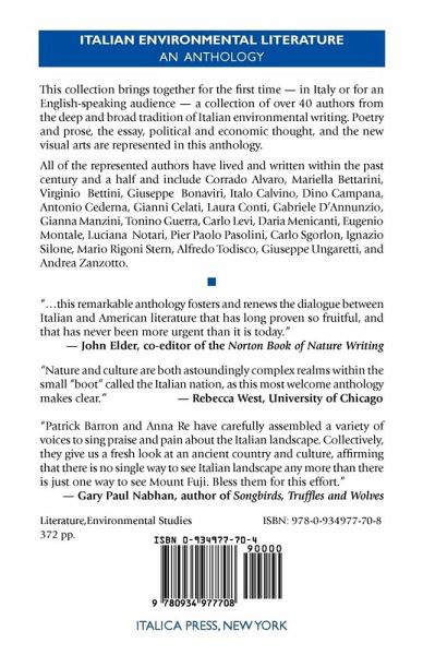 "Italian Environmental Literature" brings together, for the first time - in Italy or for an English-speaking audience - a collection of over 40 authors from the deep and broad tradition of Italian environmental writing. Poetry and prose, the essay, the political and economic tract, and the new visual arts are all represented in this collection. "Environmental thought and writing in America have long profited from their dialogue with Italy's literature of the earth. From a certain perspective, the modern environmental movement might even be said to have begun in Italy. It was in this ancient land and culture, after all, while serving as Abraham Lincoln's ambassador, that George Perkins Marsh wrote his 1864 masterpiece "Man and Nature." His book, which Lewis Mumford has characterized as 'the fountainhead of the conservation movement,' was the first to argue in a scientifically informed way that human actions could inflict significant, long-lasting damage on natural systems.... "Indeed, one of the gifts Italy offers to American writers and thinkers has always been a deeper and more complex historical vision. In exploring the dialogue of nature and culture, Italian authors frequently look back, not only to past writers such as Lucretius and Virgil, but also to the mythic, pastoral, and agricultural history of the peninsula.... The reverberant, mythic aspect of the past in Italian literature is especially striking in the poetry included here (and in many instances translated so beautifully by Patrick Barron). Not just the animals, but also the trees, the rain, the seasons, the sky, death, rivers, and the poets' own bodies, become conduits for ancient and mysterious powers of the earth. Natural phenomena for these poets can embody history and divinity as well as the laws of physics. In the prose selections here, too, there is often a similar sense of mighty forces immanent in the mundane details of our surroundings. "All of the represented authors have lived and written within the past century and a half. One of the realities of Italian life in this period - extending right up through the decade after World War II - has been the dire poverty of many country people. Living at the edge of starvation may sometimes lend an hallucinatory vividness to sensory perception, as it did so many years earlier for the voluntarily famished St. Francis. In addition, though, the pervasive fact of such deprivation often leads to a heightened concern for social and economic justice in writers like Grazia Deledda and Carlo Levi. "This model of integrating natural landscapes into a broader political discourse can be especially helpful to American environmentalists today, as we try to relate both our wilderness movement and our transcendentalist tradition in nature writing more directly to such historical realities as the Civil War, the Great Depression, and the persistence of racial polarization in our society. An awareness of social conditions that shape both landscapes and the fate of rural communities contributes to the highly sophisticated and strategic rhetoric of the environmentalists with whom this collection ends.... "Through such connections and many more, this remarkable anthology fosters and renews the dialogue between Italian and American literature that has long proven so fruitful, and that has never been more urgent than it is today."- From the Foreword by John Elder, Middlebury College