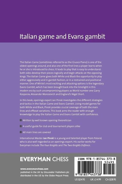 The Italian Game (sometimes referred to as the Giuoco Piano) is one of the oldest openings around, and also one of the first lines players learn when they are introduced to chess. It leads to play that is easy to understand: both sides develop their pieces logically and begin attacks on the opposing kings. The Italian Game gives both White and Black the opportunity to play either aggressively and in gambit fashion, or in a restrained and positional manner. One of White's most exciting and attacking options is the legendary Evans Gambit, which has been brought back into the limelight in this modern era by such uncompromising players as World number one Garry Kasparov, Alexander Morozevich,and England's Nigel Short. In this book, openings expert Jan Pinski investigates the different strategies and tactics in the Italian Game and Evans Gambit. Using model games for both White and Black, Pinski provides crucial coverage of both the main lines and offbeat variations. This book arms readers with enough knowledge to play the Italian Game and Evans Gambit with confidence. >Written by a well-known opening theoretician >A useful guide for club and tournament players alike >All main lines are covered