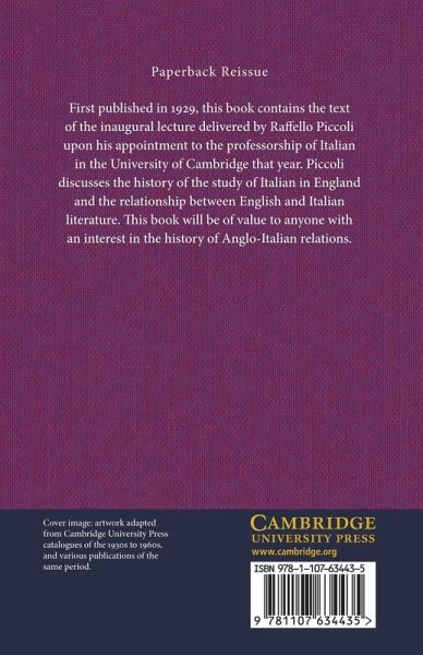 First published in 1929, this book contains the text of the inaugural lecture delivered by Raffello Piccoli upon his appointment to the professorship of Italian in the University of Cambridge that year. Piccoli discusses the history of the study of Italian in England and the relationship between English and Italian literature. This book will be of value to anyone with an interest in the history of Anglo-Italian relations.