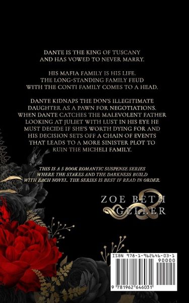 In the dark and treacherous underworld, Dante Micheli needs to obtain a crucial port for his empire but faces resistance from his enemy. His daring plan leads him to kidnap his enemy's daughter, the art student Juliet. What starts as a ruthless power play takes an unexpected turn, plunging Dante and Juliet into a deadly game of cat and mouse. As the walls of their captor-captive relationship crumble, they find themselves on the run. Will Dante and Juliet survive her father's wrath? The Micheli brothers all have a part to play in keeping the family business growing. This is the beginning of the mafia romance series that takes place in Italy and ends in Russia as they hunt the person who has framed Dante for murder. Enter their dark world filled with plot twists, suspense, and spice. Grab your book today.