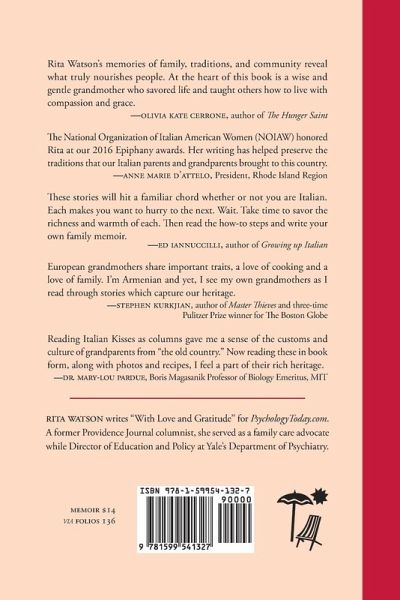 Literary Nonfiction. Italian Studies. Rita Watson's memories of family, traditions, and community reveal what truly nourishes people. At the heart of this book is a wise and gentle grandmother who savored life and taught others how to live with compassion and grace.--Olivia Kate Cerrone The National Organization of Italian American Women (NOIAW) honored Rita at our 2016 Epiphany awards. Her writing has helped preserve the traditions that our Italian parents and grandparents brought to this country.--Anne Marie D'Attelo These stories will hit a familiar chord whether or not you are Italian. Each makes you want to hurry to the next. Wait. Take time to savor the richness and warmth of each. Then read the how-to steps and write your own family memoir.--Ed Iannuccilli European grandmothers share important traits, a love of cooking and a love of family. I'm Armenian and yet, I see my own grandmothers as I read through stories which capture our heritage.--Stephen Kurkjian Reading ITALIAN KISSES as columns gave me a sense of the customs and culture of grandparents from 'the old country.' Now reading these in book form, along with photos and recipes, I feel a part of their rich heritage.--Dr. Mary-Lou Pardue