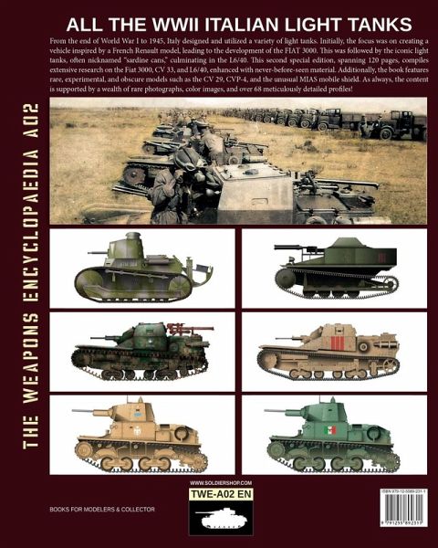 From the end of World War I to 1945, Italy designed and utilized a variety of light tanks. Initially, the focus was on creating a vehicle inspired by a French Renault model, leading to the development of the FIAT 3000. This was followed by the iconic light tanks, often nicknamed "sardine cans," culminating in the L6/40. This second special edition, spanning 120 pages, compiles extensive research on the Fiat 3000, CV 33, and L6/40, enhanced with never-before-seen material. Additionally, the book features rare, experimental, and obscure models such as the CV 29, CVP-4, and the unusual MIAS mobile shield. As always, the content is supported by a wealth of rare photographs, color images, and over 68 meticulously detailed profiles! Second album in the new format and layout 8x10 inch for 120 pages!