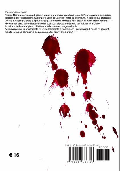 Dalla presentazione: "Italian Noir è un'antologia di giovani autori, più o meno esordienti, nata dall'inarrestabile e contagiosa passione dell'Associazione Culturale "I Sogni di Carmilla" verso la letteratura, in tutte le sue sfumature. Anche in quelle più cupe e 'spaventose'.[...] La nostra antologia ha il pregio di avere storie ognuna diversa dall'altra, dalle detective stories tout cour al pulp a tinte forti, dal poliziesco al giallo, in cui a volte l'autore gioca col lettore e lo fa con una pungente ironia. Vi spaventerete, vi arrabbierete, vi immedesimerete e riderete con i personaggi di questi 37 racconti. Sarete in buona compagnia e, questo è certo, non vi annoierete". L'antologia è stata curata da Gisella Calabrese e Giuseppe Mallozzi