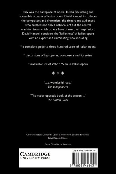 Italy was the birthplace of opera. In this authoritative and accessible account of Italian opera, David Kimbell introduces those who, over three hundred years, created not only a national tradition but the central tradition from which others have drawn their inspiration. He traces the history of Italian opera from its origins in the humanism of the Renaissance to Puccini in the early twentieth century, drawing attention not only to musical issues but also to the social, literary, and philosophical ideas that have shaped modern Italian civilization.