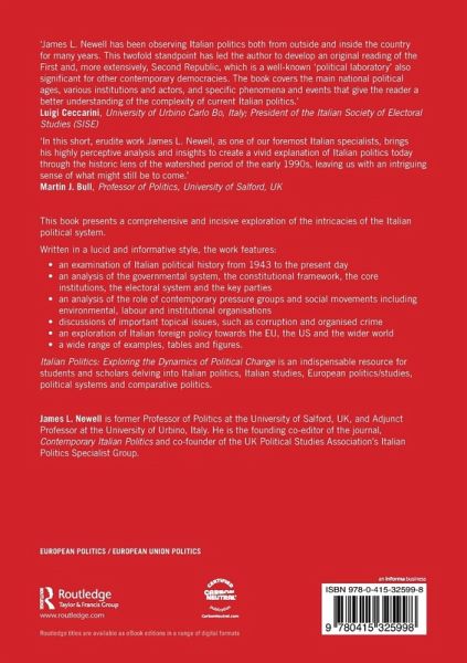 'James L. Newell has been observing Italian politics both from outside and inside the country for many years. This twofold standpoint has led the author to develop an original reading of the First and, more extensively, Second Republic, which is a well-known 'political laboratory' also significant for other contemporary democracies. The book covers the main national political ages, various institutions and actors, and specific phenomena and events that give the reader a better understanding of the complexity of current Italian politics.'