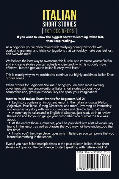 If you want to know the biggest secret to learning Italian fast, then keep reading... As a beginner, you're often tasked with studying boring textbooks with confusing grammar and tricky conjugations that can quickly make you feel lost and overwhelmed. We believe the best way to overcome this hurdle is to immerse yourself in fun and engaging stories you can actually understand, which is not only more effective, but can get you to Italian fluency even faster! This is exactly what inspired us to continue our Italian Short Stories series. Enter Italian Stories for Beginners Vol 2: You will find 20 easy-to-read, engaging, and fun stories that will not only help you to dramatically expand your vocabulary but it gives you the tools to improve your grasp of the French language. Boost your comprehension, grow your vocabulary and spark your imagination with these ten unconventional Italian short stories! All stories are written with beginner Italian learners in mind using vocabulary that you could easily use in your day-to-day conversations. With that said, it is highly recommended to have a basic understanding of Italian to achieve maximum enjoyment and effectiveness of the lessons. This program is excellent for those who want to get an introduction to the language or brush up on their Italian language skills. How to Read Italian Short Stories for Beginners Vol 2:Each story contains an important lesson in the Italian language (Verbs, Adjectives, Past Tense, Giving Directions, and more), involving an interesting and entertaining story with realistic dialogues and day-to-day situations. A summary in Italian and in English of what you just read, both to review the lesson and for you to gauge your comprehension of what the tale was about. At the end of those summaries, you'll be provided with a list of vocabulary found in the lesson, as well as phrases that you may not have understood the first time! Finally, you'll be given clever questions in Italian, so you can prove that you learned something in the stories. Even if you have failed multiple times in the past to learn Italian, these short stories will give you the confidence and boost you need to finally grasp the language! So scroll back up, click "Add to Cart" and get your copy of Italian Short Stories for Beginners Vol 2 to start learning the fun way!