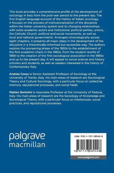 This book provides a comprehensive profile of the development of sociology in Italy from the post-war period to the present day. The first English-language account of the history of Italian sociology, it focuses on the process of institutionalization of the discipline within the Italian university system and its changing relationships with extra-academic actors and institutions: political parties, unions, the Catholic Church, political and social movements, as well as local and national governments. Arranged chronologically across eight chapters, it presents all major steps in the development of the discipline in a theoretically-informed but accessible way. The authors explore the pioneering phase of the 1950s to the establishment of the first academic chairs in the 1960s, from the student revolts of 1968 to the creation of the first sociological association in the 1980s and up to the present day. It will appeal to social science and history scholars and students, as well as readers interested in the history of Contemporary Italy.