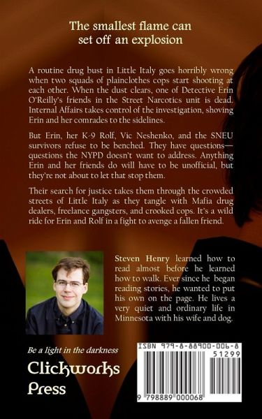 The smallest flame can set off an explosion A routine drug bust in Little Italy goes horribly wrong when two squads of plainclothes cops start shooting at each other. When the dust clears, one of Detective Erin O'Reilly's friends in the Street Narcotics unit is dead. Internal Affairs takes control of the investigation, shoving Erin and her comrades to the sidelines. But Erin, her K-9 Rolf, Vic Neshenko, and the SNEU survivors refuse to be benched. They have questions-questions the NYPD doesn't want to address. Anything Erin and her friends do will have to be unofficial, but they're not about to let that stop them. Their search for justice takes them through the crowded streets of Little Italy as they tangle with Mafia drug dealers, freelance gangsters, and crooked cops. It's a wild ride for Erin and Rolf in a fight to avenge a fallen friend.