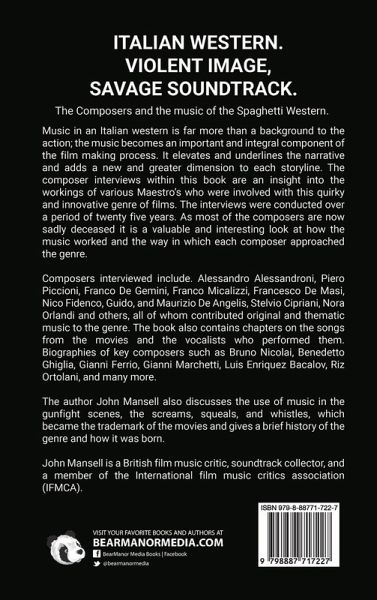 ITALIAN WESTERN. VIOLENT IMAGE, SAVAGE SOUNDTRACK. The Composers and the music of the Spaghetti Western. Music in an Italian western is far more than a background to the action; the music becomes an important and integral component of the film making process. It elevates and underlines the narrative and adds a new and greater dimension to each storyline. The composer interviews within this book are an insight into the workings of various Maestro's who were involved with this quirky and innovative genre of films. The interviews were conducted over a period of twenty five years. As most of the composers are now sadly deceased it is a valuable and interesting look at how the music worked and the way in which each composer approached the genre. Composers interviewed include. Alessandro Alessandroni, Piero Piccioni, Franco De Gemini, Franco Micalizzi, Francesco De Masi, Nico Fidenco, Guido, and Maurizio De Angelis, Stelvio Cipriani, Nora Orlandi and others, all of whom contributed original and thematic music to the genre. The book also contains chapters on the songs from the movies and the vocalists who performed them. Biographies of key composers such as Bruno Nicolai, Benedetto Ghiglia, Gianni Ferrio, Gianni Marchetti, Luis Enriquez Bacalov, Riz Ortolani, and many more. The author John Mansell also discusses the use of music in the gunfight scenes, the screams, squeals, and whistles, which became the trademark of the movies and gives a brief history of the genre and how it was born. John Mansell is a British film music critic, soundtrack collector, and a member of the International film music critics association (IFMCA).