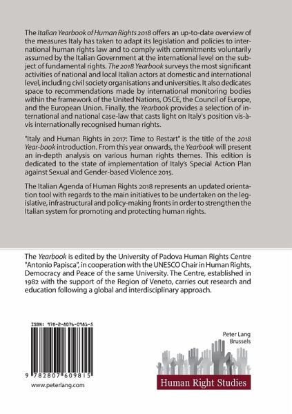 The Italian Yearbook of Human Rights 2018 offers an up-to-date overview of the measures Italy has taken to adapt its legislation and policies to inter-national human rights law and to comply with commitments voluntarily assumed by the Italian Government at the international level on the sub-ject of fundamental rights. The 2018 Yearbook surveys the most significant activities of national and local Italian actors at domestic and international level, including civil society organisations and universities. It also dedicates space to recommendations made by international monitoring bodies within the framework of the United Nations, OSCE, the Council of Europe, and the European Union. Finally, the Yearbook provides a selection of in-ternational and national case-law that casts light on Italy's position vis-à-vis internationally recognised human rights."Italy and Human Rights in 2017: Time to Restart" is the title of the 2018 Year-book introduction. From this year onwards, the Yearbook will present an in-depth analysis on various human rights themes. This edition is dedicated to the state of implementation of Italy's Special Action Plan against Sexual and Gender-based Violence 2015.The Italian Agenda of Human Rights 2018 represents an updated orienta-tion tool with regards to the main initiatives to be undertaken on the leg-islative, infrastructural and policy-making fronts in order to strengthen the Italian system for promoting and protecting human rights.