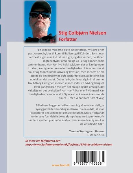 "En samling moderne digte og kortprosa, hvis ord er en passioneret hyldes til Rom, til Italien og til Kvinden. Som læser nærmest suges man ind i disse digte, og den verden, de åbner. Digtene flyder umærkeligt ud i et og danner en fin sammenhæng. Man kan live helt i tvivl, om det er kærligheden til Italien, kærligheden selv eller kærligheden til Kvinden, der så smukt og tankefuldt beskrives og leves ud; men mellem de blå bjerge og pinjetræernes duft opstår følelsen, at det ene ikke udelukker det andet. Det er lyrik, der lever sig ind i drømme, tro, håb og kærlighed med en mands inderste tvivl og længsel. Hvor går grænsen mellem det mulige og det umulige, det virkelige og det uvirkelige? Kan man? Skal man? Må man? Kan kærligheden overvinde alt? Og svaret må svæve i de susende pinjer ... men vi har hver især et valg. Billederne lægger en stille stemning af vemodets blå, ja, synliggør både vemod og melankoli på en måde, så man accepterer det som noget ganske naturligt. Maria Yedgarian Andersens forsidebilled og slutopslaget med samme motiv samler i sjælden grad selve ånden i denne usædvanlig smukke og velskrevne bog. Ingen tvivl om, at denne digtsamling at forfatterens hidtil bedste!" Yvonne Skyttegaard Hansen Oktober 2014 Se mere om forfatteren her: http://www.forfatterportalen.dk/forfatter/97/stig-colbjoern-nielsen