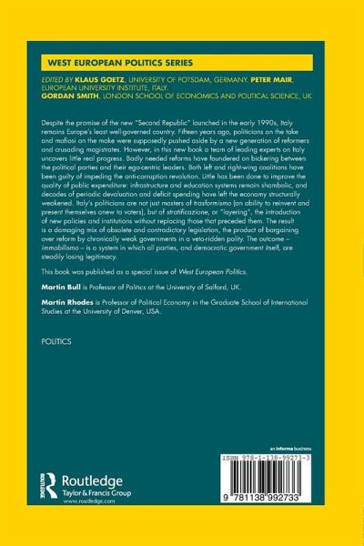 Despite the promise of the new "Second Republic" launched in the early 1990s, Italy remains Europe's least well-governed country. Fifteen years ago, politicians on the take and mafiosi on the make were supposedly pushed aside by a new generation of reformers and crusading magistrates. However, in this new book a team of leading experts on Italy uncovers little real progress. Badly needed reforms have foundered on bickering between the parties and their ego-centric leaders. Both left and right-wing coalitions have been guilty of impeding the anti-corruption revolution. Little has been done to improve the quality of public expenditure: infrastructure and education systems remain shambolic, and decades of periodic devaluation and deficit spending have left the economy structurally weakened. Italy's politicians are not just masters of trasformismo (an ability to reinvent and present themselves anew to voters), but of stratificazione, or "layering", the introduction of new policies and institutions without replacing those that preceded them. The result is a damaging mix of obsolete and contradictory legislation, the product of bargaining over reform by chronically weak governments in a veto-ridden polity. The outcome - immobilismo - is a system in which all parties, and democratic government itself, are steadily losing legitimacy. This book was published as a special issue of West European Politics.
