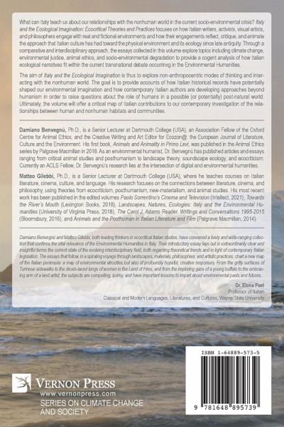 What can Italy teach us about our relationships with the nonhuman world in the current socio-environmental crisis? 'Italy and the Ecological Imagination: Ecocritical Theories and Practices' focuses on how Italian writers, activists, visual artists, and philosophers engage with real and fictional environments and how their engagements reflect, critique, and animate the approach that Italian culture has had toward the physical environment and its ecology since late antiquity. Through a comparative and interdisciplinary approach, the essays collected in this volume explore topics including climate change, environmental justice, animal ethics, and socio-environmental degradation to provide a cogent analysis of how Italian ecological narratives fit within the current transnational debate occurring in the Environmental Humanities. The aim of 'Italy and the Ecological Imagination' is thus to explore non-anthropocentric modes of thinking and interacting with the nonhuman world. The goal is to provide accounts of how Italian historical records have potentially shaped our environmental imagination and how contemporary Italian authors are developing approaches beyond humanism in order to raise questions about the role of humans in a possible (or potentially) post-natural world. Ultimately, the volume will offer a critical map of Italian contributions to our contemporary investigation of the relationships between human and nonhuman habitats and communities.