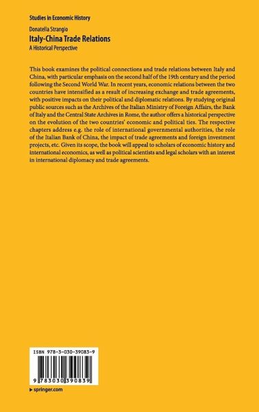This book examines the political connections and trade relations between Italy and China, with particular emphasis on the second half of the 19th century and the period following the Second World War. In recent years, economic relations between the two countries have intensified as a result of increasing exchange and trade agreements, with positive impacts on their political and diplomatic relations. By studying original public sources such as the Archives of the Italian Ministry of Foreign Affairs, the Bank of Italy and the Central State Archives in Rome, the author offers a historical perspective on the evolution of the two countries' economic and political ties. The respective chapters address e.g. the role of international governmental authorities, the role of the Italian Bank of China, the impact of trade agreements and foreign investment projects, etc. Given its scope, the book will appeal to scholars of economic history and international economics, as well as politicalscientists and legal scholars with an interest in international diplomacy and trade agreements.