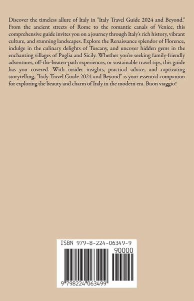 "Embark on a captivating journey through Italy with the 'Italy Travel Guide 2024 and Beyond.' Discover the timeless allure of Rome's ancient wonders, Venice's romantic canals, and Florence's Renaissance splendor. Dive into the culinary delights of Tuscany, uncover hidden gems in Puglia and Sicily, and bask in the serenity of the Italian Lakes. Whether you're seeking family-friendly adventures, sustainable travel tips, or off-the-beaten-path experiences, this guide has you covered. From practical advice to immersive cultural insights, let this guide be your companion as you explore the beauty and charm of Italy in 2024 and beyond."