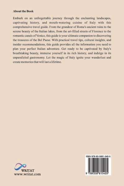 Embark on an unforgettable journey through the enchanting landscapes, captivating history, and mouthwatering cuisine of Italy with this comprehensive travel guide. From the grandeur of Rome's ancient ruins to the serene beauty of the Italian lakes, from the art-filled streets of Florence to the romantic canals of Venice, this guide is your ultimate companion to discovering the treasures of the Bel Paese. With practical travel tips, cultural insights, and insider recommendations, this guide provides all the information you need to plan your perfect Italian adventure. Get ready to be captivated by Italy's breathtaking beauty, immerse yourself in its rich history, and indulge in its unparalleled gastronomy. Let the magic of Italy ignite your wanderlust and create memories that will last a lifetime.