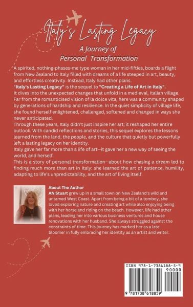 A spirited, nothing-phases-me type woman in her mid-fifties, boards a flight from New Zealand to Italy filled with dreams of a life steeped in art, beauty, and effortless creativity. Instead, Italy had other plans. "Italy's Lasting Legacy" is the sequel to "Creating a Life of Art in Italy". It dives into the unexpected changes that unfold in a medieval Italian village. Far from the romanticised vision of la dolce vita, here was a community shaped by generations of hardship and resilience. In the quiet simplicity of village life, she found herself enlightened, challenged, softened and changed in ways she never anticipated. Through these years, Italy didn't just inspire her art; it reshaped her entire outlook. With candid reflections and stories, this sequel explores the lessons learned from the land, the people, and the culture that quietly but powerfully left a lasting legacy on her identity. Italy gave her far more than a life of art-it gave her a new way of seeing the world, and herself. This is a story of personal transformation-about how chasing a dream led to finding much more than art in Italy: she learned the art of patience, humility, adapting to life's unpredictability, and the art of living itself. From the Author: But my life wasn't always like this. Before my move to Italy I was drowning in the chaos of a life that was missing a clear purpose. I had spent the better part of my career as a self-employed businesswoman, working long hours and filling my home with all the symbols of what's conventionally seen as a 'successful life.' Then, one day, an email arrived presenting me with a choice: continue on the same path, or dive headfirst into a new life as an artist.