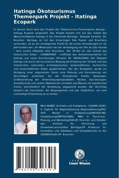 In diesem Buch wird das Projekt des Ökotourismus-Themenparks Itatinga - Itatinga Ecopark vorgestellt. Das Projekt bezieht sich auf das Gebiet des Wasserkraftwerks Itatinga in der Gemeinde Bertioga - Baixada Santista, SP, Brasilien. Bertioga ist mit den Ursprüngen São Paulos und Brasiliens verbunden, da es ein strategischer Punkt für die ersten Ansiedlungen im 16. Jahrhundert war, ein Meilenstein bei der Verteidigung von Vila de São Vicente - dem ersten offiziellen Dorf Brasiliens. Der SP-Rat für den Schutz des historischen Erbes - CONDEPHAAT - eröffnete das Aufnahmeverfahren für Itatinga und seine Einrichtungen (Prozess Nr. 40036/2000). Der Ökopark Itatinga soll durch die touristische Nutzung die Erhaltung der Umwelt und des historischen, kulturellen, architektonischen, landschaftlichen, technischen und landschaftlichen Erbes gewährleisten. Bei der Konzeption wurde zur Festigung einer allgemeinen Vision eine Planung und Formulierung von Vorschlägen entwickelt, bei der thematischeInhalte, Nutzungen, Größenordnung der Unterstützungskapazitäten, Risiken, Ausrüstungen, Umweltschutz und andere Maßnahmen ermittelt und Räume mit spezifischen Zielen, einschließlich der Verwaltung, abgegrenzt wurden. Der Vorschlag bewahrt die Geschichte, die Vergangenheit und das Gedächtnis, um eine nachhaltige Entwicklung zu erreichen.