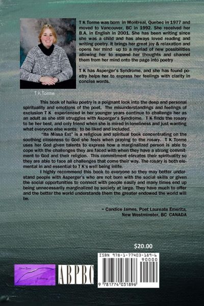 T K Torme suffers from Asperger's Syndrome but she was not diagnosed for many years and subsequently she suffered a great deal of trauma being misunderstood in her younger formative years. This book of over 275 haiku poems is a poignant look into the deep and personal spirituality and emotions of the poet. The misunderstandings and feelings of exclusion T K experienced in her younger years continue to challenge her as an adult as she still struggles with Asperger's Syndrome. T K finds the rosary to be her best, and only friend when she is mired in loneliness and just wanting what everyone else wants: to be liked and included. "Ite Missa Est" is a religious and spiritual book concentrating on the soothing closeness to God she feels when praying to the rosary. T K Torme uses her God given talents to express how a marginalized person is able to cope with the challenges they are faced with when they have a strong commitment to God and their religion. This commitment elevates their spirituality so they are able to face all challenges that come their way. The rosary is both elemental in and essential to T K's well being inlife.T K Torme, through her own personal lens, takes us into her spiritual world which is the world of a person that has Asperger's Syndrome, and unable to communicate easily with the non Asperger's surroundings she finds herself often immersed in. T K Torme is a good Catholic and a fine child of God and this book is a lovely offering filled with grace that she has given to the world.I highly recommend this book to everyone so they may better understand people with Asperger's who are not born with the social skills or given the social opportunities to connect with people easily and many times end up being unnecessarily marginalized by society at large. They have much to offer and the better the world understands them the greater endowed the world will be.
