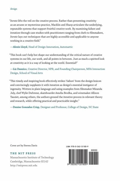 How to confront, embrace, and learn from the unavoidable failures of creative practice; with case studies that range from winemaking to animation. Failure is an inevitable part of any creative practice. As game designers, John Sharp and Colleen Macklin have grappled with crises of creativity, false starts, and bad outcomes. Their tool for coping with the many varieties of failure: iteration, the cyclical process of conceptualizing, prototyping, testing, and evaluating. Sharp and Macklin have found that failure--often hidden, covered up, a source of embarrassment--is the secret ingredient of iterative creative process. In Iterate, they explain how to fail better. After laying out the four components of creative practice--intention, outcome, process, and evaluation--Sharp and Macklin describe iterative methods from a wide variety of fields. They show, for example, how Radiolab cohosts Jad Abumrad and Robert Krulwich experiment with radio as a storytelling medium; how professional skateboarder Amelia Bródka develops skateboarding tricks through trial and error; and how artistic polymath Miranda July explores human frailty through a variety of media and techniques. Whimsical illustrations tell parallel stories of iteration, as hard-working cartoon figures bake cupcakes, experiment with levitating office chairs, and think outside the box in toothbrush design ("let's add propellers!"). All, in their various ways, use iteration to transform failure into creative outcomes. With Iterate, Sharp and Macklin offer useful lessons for anyone interested in the creative process. Case Studies: Allison Tauziet, winemaker; Matthew Maloney, animator; Jad Abumrad and Robert Krulwich, Radiolab cohosts; Wylie Dufresne, chef; Nathalie Pozzi, architect, and Eric Zimmerman, game designer; Andy Milne, jazz musician; Amelia Bródka, skateboarder; Baratunde Thurston, comedian; Cas Holman, toy designer; Miranda July, writer and filmmaker