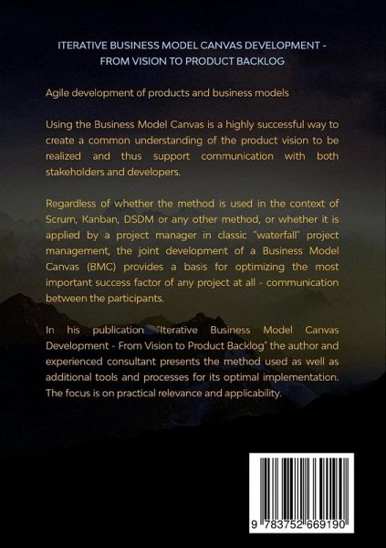 Iterative Business Model Canvas Development - from vision to product backlogAgile development of products and business modelsUsing the Business Model Canvas is a highly successful way to create a common understanding of the product vision to be realized and thus support communication with both stakeholders and developers.Regardless of whether the method is used in the context of Scrum, Kanban, DSDM or any other method, or whether it is applied by a project manager in classic "waterfall" project management, the joint development of a Business Model Canvas (BMC) provides a basis for optimizing the most important success factor of any project at all - communication between the participants.In his publication "Iterative Business Model Canvas Development - From Vision to Product Backlog" the author and experienced consultant presents the method used as well as additional tools and processes for its optimal implementation. The focus is on practical relevance and applicability.