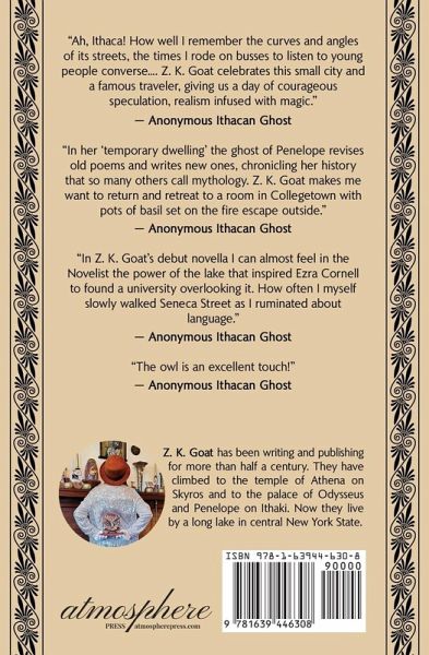 "Ah, Ithaca! How well I remember the curves and angles of its streets, the times I rode on busses to listen to young people converse.... Z. K. Goat celebrates this small city and a famous traveler, giving us a day of courageous speculation, realism infused with magic." - Anonymous Ithacan Ghost "In her 'temporary dwelling' the ghost of Penelope revises old poems and writes new ones, chronicling her history that so many others call mythology. Z. K. Goat makes me want to return and retreat to a room in Collegetown with pots of basil set on the fire escape outside." - Anonymous Ithacan Ghost "In Z. K. Goat's debut novella I can almost feel in the Novelist the power of the lake that inspired Ezra Cornell to found a university overlooking it. How often I myself slowly walked Seneca Street as I ruminated about language." - Anonymous Ithacan Ghost "The owl is an excellent touch!" - Anonymous Ithacan Ghost AUTHOR'S BIO: Z. K. Goat has been writing and publishing for more than half a century. They have climbed to the temple of Athena on Skyros and to the palace of Odysseus and Penelope on Ithaki. Now they live by a long lake in central New York State.