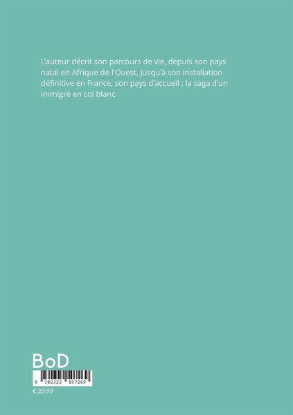 L'auteur décrit son parcours de vie, depuis son pays natal en Afrique de l'Ouest, jusqu'à son installation définitive en France, son pays d'accueil : la saga d'un immigré en col blanc