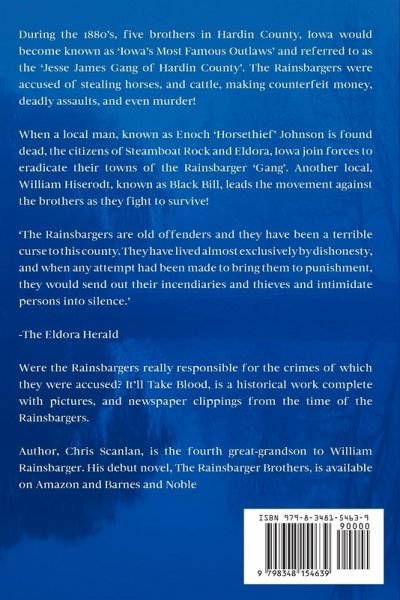 During the 1880's, five brothers in Hardin County, Iowa would become known as 'Iowa's Most Famous Outlaws' and referred to as the 'Jesse James Gang of Hardin County'. The Rainsbargers were accused of stealing horses, and cattle, making counterfeit money, deadly assaults, and even murder! When a local man, known as Enoch 'Horsethief' Johnson is found dead, the citizens of Steamboat Rock and Eldora, Iowa join forces to eradicate their towns of the Rainsbarger 'Gang'. Another local, William Hiserodt, known as Black Bill, leads the movement against the brothers as they fight to survive! 'The Rainsbargers are old offenders and they have been a terrible curse to this county. They have lived almost exclusively by dishonesty, and when any attempt had been made to bring them to punishment, they would send out their incendiaries and thieves and intimidate persons into silence.' -The Eldora Herald Were the Rainsbargers really responsible for the crimes of which they were accused? It'll Take Blood, is a historical work complete with pictures, newspaper clippings, and affidavits from the time of the Rainsbargers. Author, Chris Scanlan, is the fourth great-grandson to William Rainsbarger. His debut novel, The Rainsbarger Brothers, is available on Amazon and Barnes and Noble.