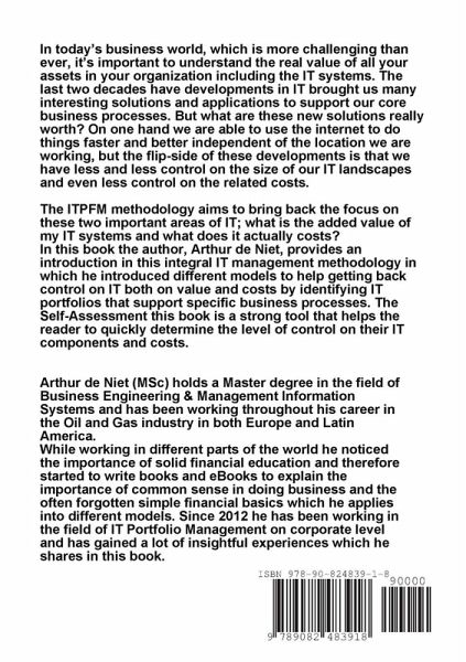 This book is about the the ITPfM - Integral IT Portfolio Management Methodology in which the author, Arthur de Niet, provides an introduction in the ITPfM methodology which focusses on the Value and Costs of IT systems. With different models (Integral Value/Cost model) and guidelines provides the author the help help needed to get insight in the value of IT and it's costs by identifying IT portfolios that support a specific business process. This book contains a Self Assessment that helps the reader to quickly determine the level of control on his/her IT components and costs.