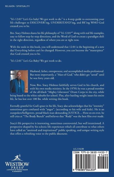 "It's 12:01® Let's Go baby! We got work to do." is a 4-step guide to overcoming your life challenges to DISCOVER'ing, UNDERSTAND'ing, and BE'ing WHO God created you to be. Bro. Stacy Holmes shares his life philosophy of "It's 12:01®" along with real life examples, easy to follow step-by-step directions, and the Word of God to create a paradigm shift in the right direction, regardless of where you are at right now. With the tools in this book, you will understand that 12:01 is the beginning of a new day! Everything before can't be changed. However, you can become the "masterpiece" that God created you to be. "It's 12:01" Let's Go Baby! We got work to do.