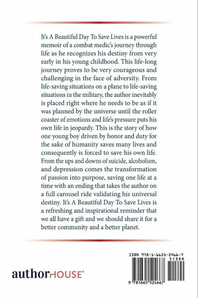It's A Beautiful Day To Save Lives is a powerful memoir of a combat medic's journey through life as he recognizes his destiny from very early in his young childhood. This life-long journey proves to be very courageous and challenging in the face of adversity. From life-saving situations on a plane to life-saving situations in the military, the author inevitably is placed right where he needs to be as if it was planned by the universe until the roller coaster of emotions and life's pressure puts his own life in jeopardy. This is the story of how one young boy driven by honor and duty for the sake of humanity saves many lives and consequently is forced to save his own life. From the ups and downs of suicide, alcoholism, and depression comes the transformation of passion into purpose, saving one life at a time with an ending that takes the author on a full carousel ride validating his universal destiny. It's A Beautiful Day To Save Lives is a refreshing and inspirational reminder that we all have a gift and we should share it for a better community and a better planet.