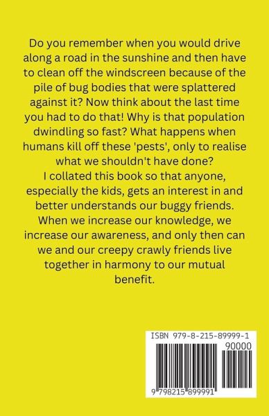 Welcome to the world of bugs! These fascinating insects are often misunderstood and squashed at the earliest opportunity, meeting their end under a rolled-up newspaper or choking to death on a poisonous insecticide that man has created. Here's a good way of judging how the insect population is rapidly dwindling. Do you remember when you would drive along a road in the sunshine and then have to clean off the windscreen because of the pile of bug bodies that were splattered against it? Now think about the last time you had to do that! Why is that population dwindling so fast? What happens when humans kill off these 'pests', only to realise what we shouldn't have done? I collated this book so that anyone, especially the kids, gets an interest in and better understands our buggy friends. When we increase our knowledge, we increase our awareness, and only then can we and our creepy crawly friends live together in harmony to our mutual benefit. The book is an educational resource. Get your copy today.
