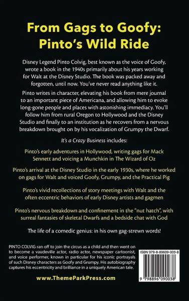 The Goofy Life of a Disney Legend Disney Legend Pinto Colvig, best known as the voice of Goofy, wrote a book in the 1940s primarily about his years working for Walt at the Disney Studio. The book was packed away and forgotten, until now. You've never read anything like it. Pinto writes in character, elevating his book from mere journal to an important piece of Americana, and allowing him to evoke long-gone people and places with astonishing immediacy. You'll follow him from rural Oregon to Hollywood and the Disney Studio and finally to an institution as he recovers from a nervous breakdown brought on by his vocalization of Grumpy the Dwarf. It's a Crazy Business includes: Pinto's early adventures in Hollywood, writing gags for Mack Sennett and voicing a Munchkin in The Wizard of Oz Pinto's arrival at the Disney Studio in the early 1930s, where he worked on gags for Walt and voiced Goofy, Grumpy, and the Practical Pig Pinto's vivid recollections of story meetings with Walt and the often eccentric behaviors of early Disney artists and gagmen Pinto's nervous breakdown and confinement in the "nut hatch", with surreal fantasies of skeletal Dwarfs and a bedside chat with God The life of a comedic genius: in his own gag-strewn words!