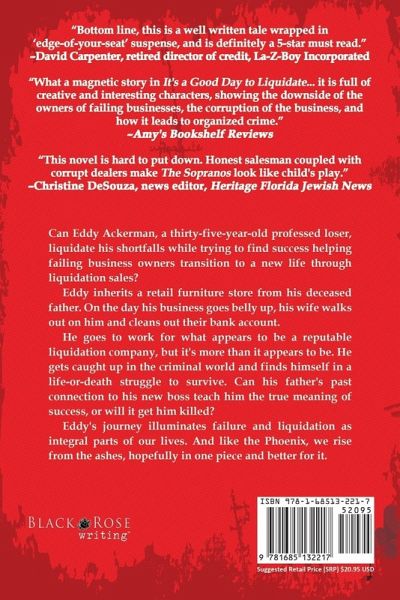 "This novel is hard to put down. Honest salesman coupled with corrupt dealers make The Sopranos look like child's play." -Heritage Florida Jewish News Can Eddy Ackerman, a thirty-five-year-old professed loser, liquidate his shortfalls while trying to find success helping failing business owners transition to a new life through liquidation sales? Eddy inherits a retail furniture store from his deceased father. On the day his business goes belly up, his wife walks out on him and cleans out their bank account. He goes to work for what appears to be a reputable liquidation company, but it's more than it appears to be. He gets caught up in the criminal world and finds himself in a life-or-death struggle to survive. Can his father's past connection to his new boss teach him the true meaning of success, or will it get him killed? Eddy's journey illuminates failure and liquidation as integral parts of our lives. And like the Phoenix, we rise from the ashes, hopefully in one piece and better for it.