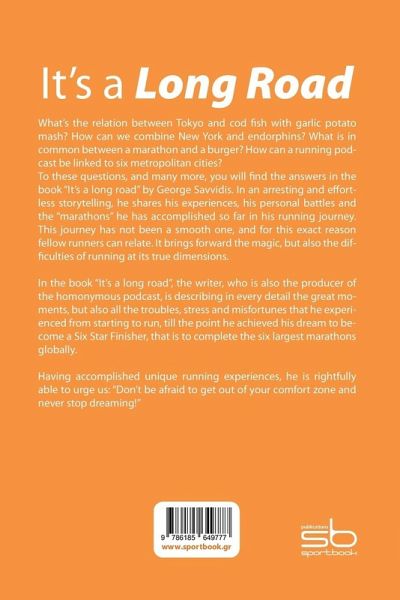 What's the relation between Tokyo and cod fish with garlic potato mash? How can we combine New York and endorphins? What is in common between a marathon and a burger? How can a running podcast be linked to six metropolitan cities? You will find answers to these questions and many more in the book "It's a long road" by George Savvidis. In an arresting and effortless storytelling, he shares his experiences, his personal battles, and the "marathons" he has accomplished so far in his running journey. This journey has not been a smooth one, and for this exact reason fellow runners can relate. It brings forward the magic, but also the difficulties of running at its true dimensions. In the book "It's a long road", the writer, who is also the producer of the homonymous podcast, is describing in every detail the great moments, but also all the troubles, stress and misfortunes that he experienced from starting to run, till the point he achieved his dream to become a Six Star Finisher, that is to complete the six largest marathons globally. Having accomplished unique running experiences, he is rightfully able to urge us: "Don't be afraid to get out of your comfort zone and never stop dreaming!"