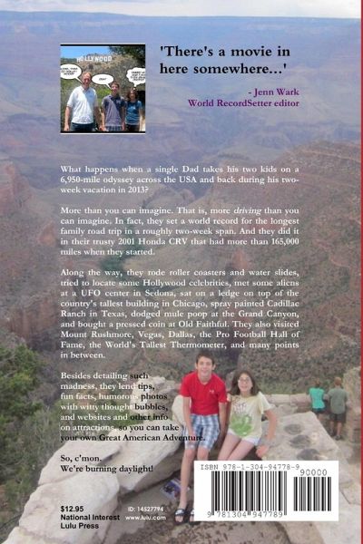 It's a Mad, Mad, Mad, Mad Trip chronicles the adventures of a single Dad taking his two kids on a 6,950-mile odyssey across the USA and back during his two-week vacation. Along the way, they set a record for the longest family road trip in a roughly two-week span, certified by RecordSetter, a competitor of Guinness World Records. And they did it in their trusty 2001 Honda CRV with more than 165,000 miles. They rode roller coasters and water slides, tried to locate some Hollywood celebrities, met some aliens at a UFO center in Sedona, sat on a ledge on top of the country's tallest building in Chicago, spray painted Cadillac Ranch, dodged mule poop at the Grand Canyon, and bought a pressed coin at Old Faithful. They also visited Mount Rushmore, Vegas, Dallas, the Pro Football Hall of Fame, and many points in between. Their book also lends tips, websites and other info on attractions, fun facts, and more resources, so you can take your own Great American Adventure.