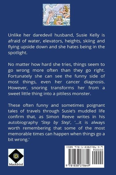 'Memories warm you up from the inside. But they also tear you apart.' Haruki Murakami, Kafka on the Shore Unlike her daredevil husband, Susie Kelly is afraid of water, elevators, heights, skiing and flying upside down and she hates being in the spotlight. No matter how hard she tries, things seem to go wrong more often than they go right. Fortunately she can see the funny side of most things, even her cancer diagnosis. However, snoring transforms her from a sweet little thing into a pitiless monster. These often funny and sometimes poignant tales of travels through Susie's muddled life confirm that, as Simon Reeve writes in his autobiography 'Step by Step', '...it is always worth remembering that some of the most memorable times can happen when things go a bit wrong.'